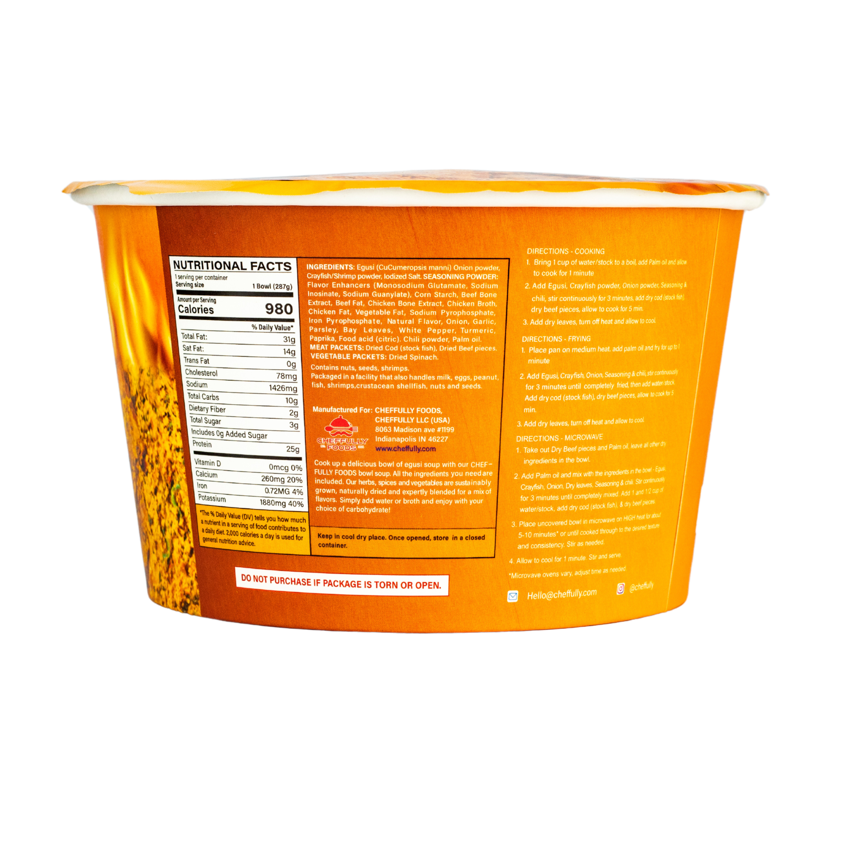 Cheffully Instant Egusi Bowl Soup is a quick, nutritious meal that brings the rich, authentic flavors of West Africa to your table in minutes. Made with premium Egusi seeds, tender beef, and aromatic spices, this hearty soup offers a creamy, savory experience. Ready in 7 minutes! And perfect for a satisfying lunch or dinner, it’s a convenient way to enjoy traditional African cuisine on the go.